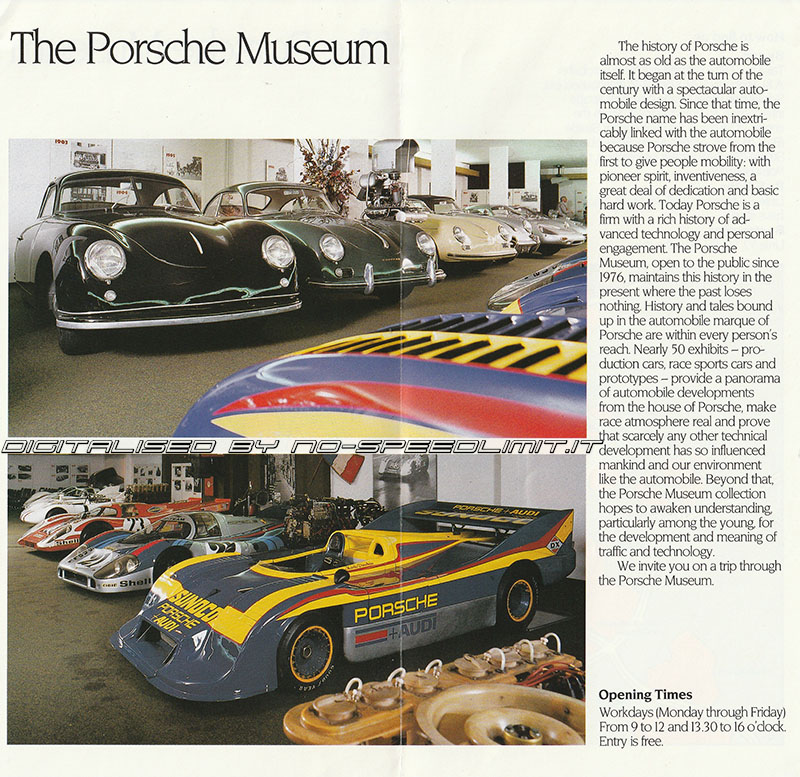 The history of Porsche is almost as old as the automobile itself. It began at the turn of the century with a spectacular automobile design. Since that time, the Porsche name has been inextricably linked with the automobile because Porsche strove from the first to give people mobility: with pioneer spirit, inventiveness, a great deal of dedication and basic hard work. Today Porsche is a firm with a rich history of advanced technology and personal engagement. The Porsche Museum, open to the public since 1976, maintains this history in the present where the past loses nothing. History and tales bound up in the automobile marque of Porsche are within every person's reach. Nearly 50 exhibits - production cars, race sports cars and prototypes - provide a panorama of automobile developments from the house of Porsche, make race atmosphere real and prove that scarcely any other technical development has so influenced mankind and our environment like the automobile. Beyond that, the Porsche Museum collection hopes to awaken understanding, particularly among the young, for the development and meaning of traffic and technology.