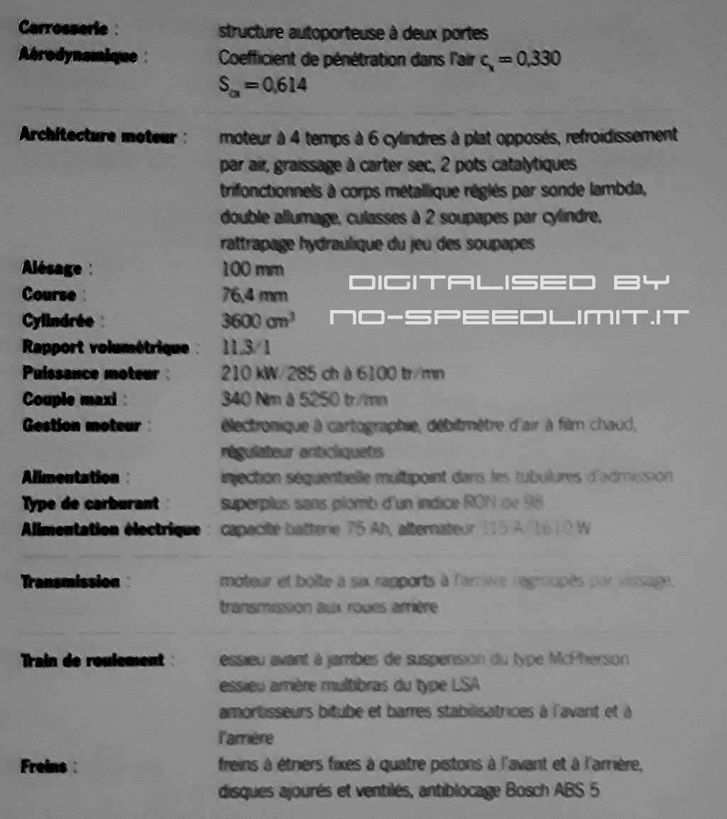 Carrosserie 911 classique avec un toit en verre coulissant à commande électrique. Technique traditionnelle faisant appel au six cylindres à plat refroidi par air, disposé à l'arrière. 3,6 litres de cylindrée, 285 ch (210 kW) à 6100 tr/mn, couple maxi. 340 Newtons-mètres à 5250 tr/mn. Boîte mécanique à six rapports ou boîte automatique Tiptronic S à quatre rapports.